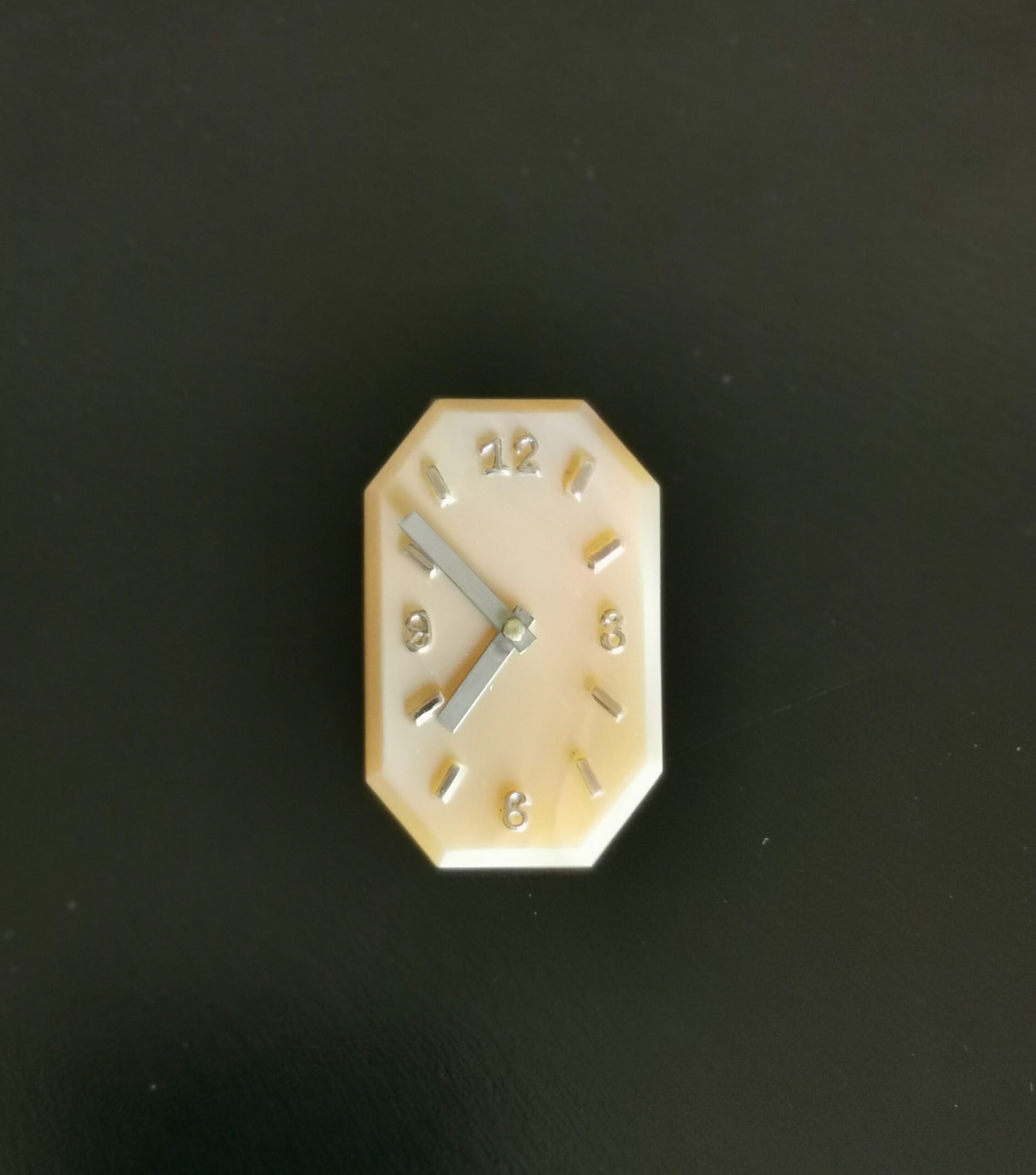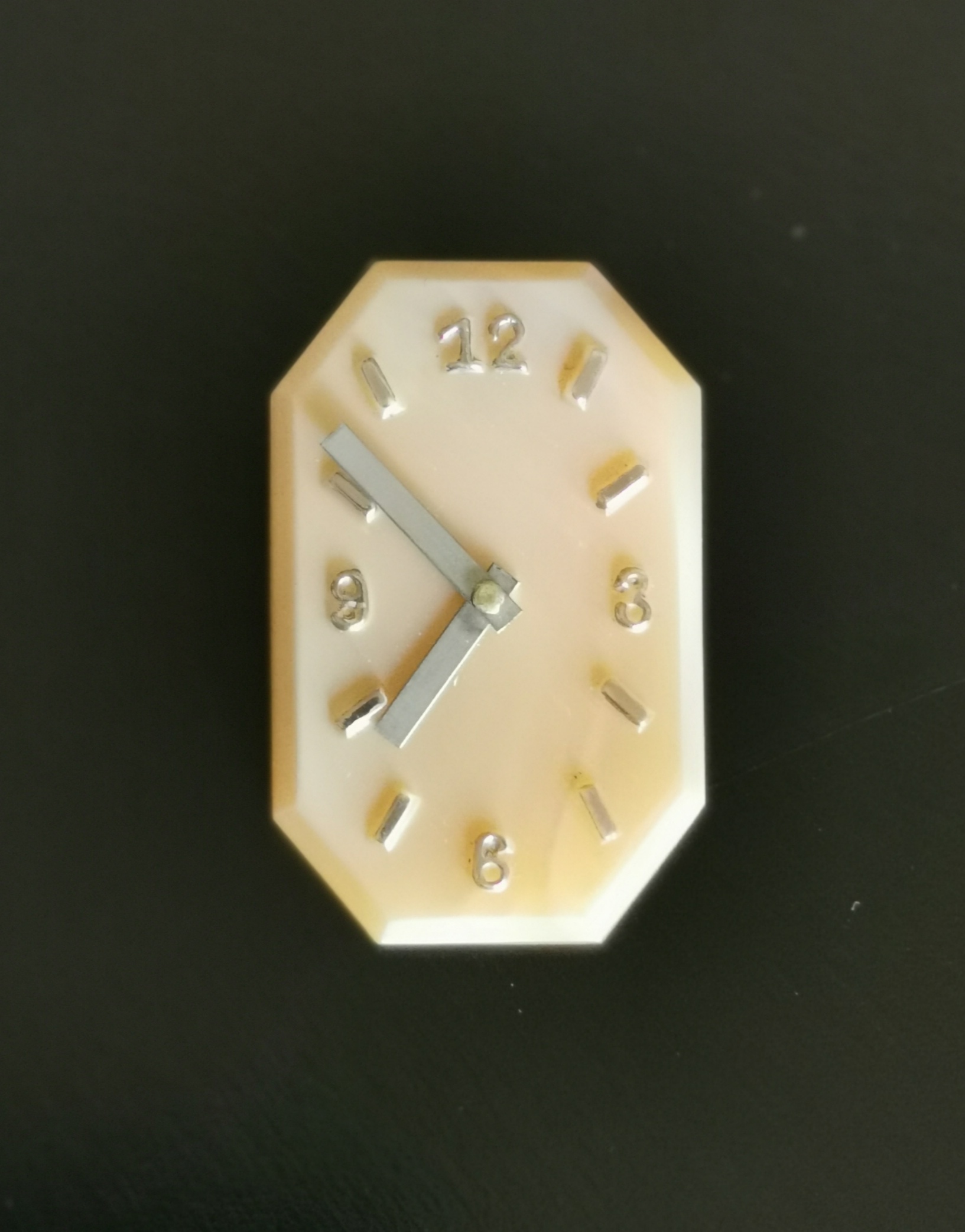 Pâte de verre, les aiguilles sont en chrome et les chiffres en laiton.