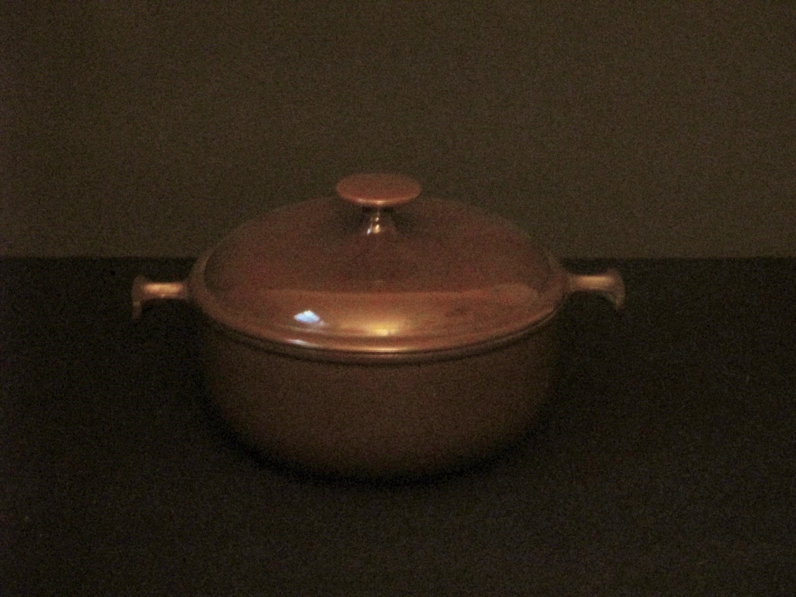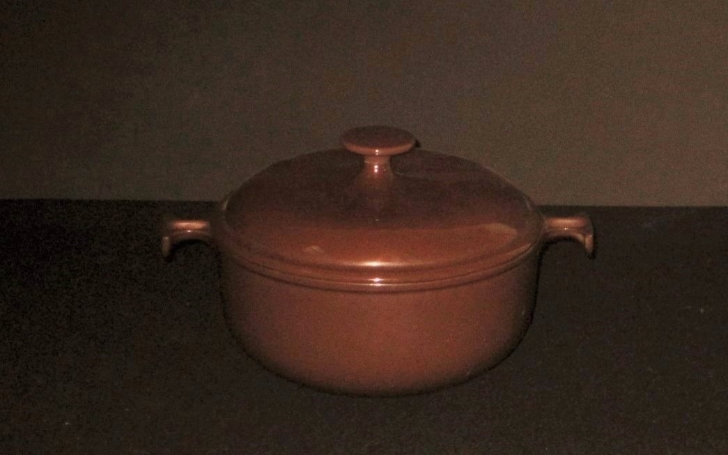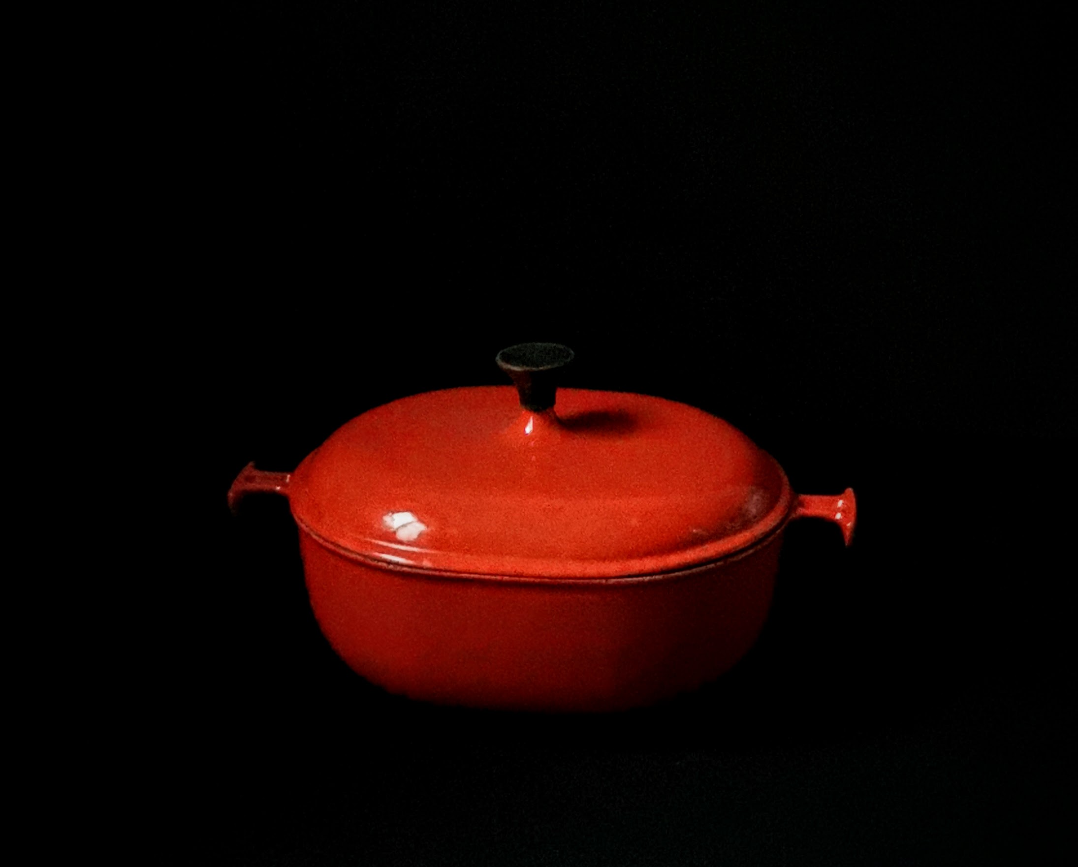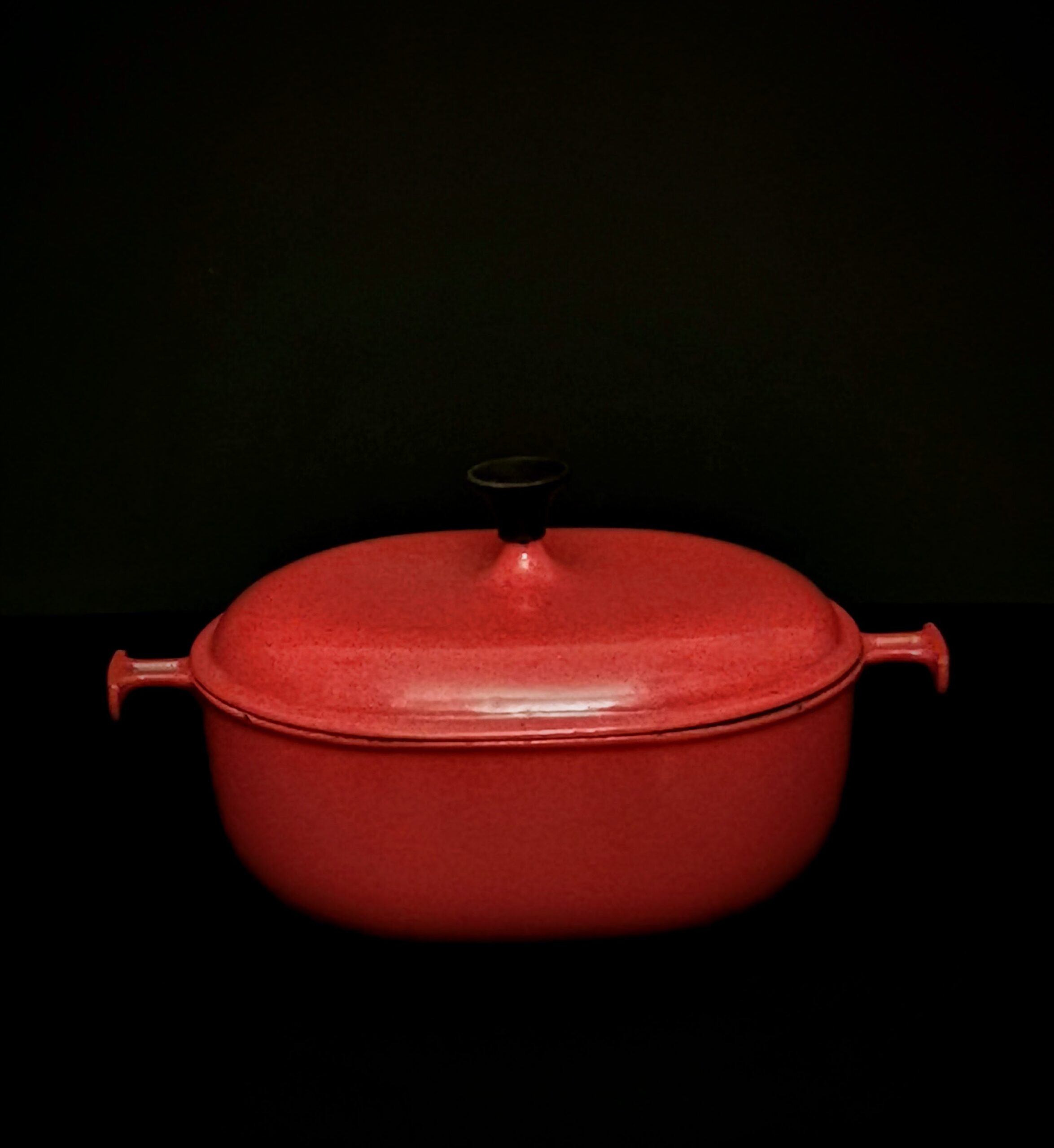 Il y en a une grosse rouge ronde à 90€ car en moins bon état, mais avec l’intérieur parfait, une ovale rouge et une ovale plate de couleur rouille sans couvercle.