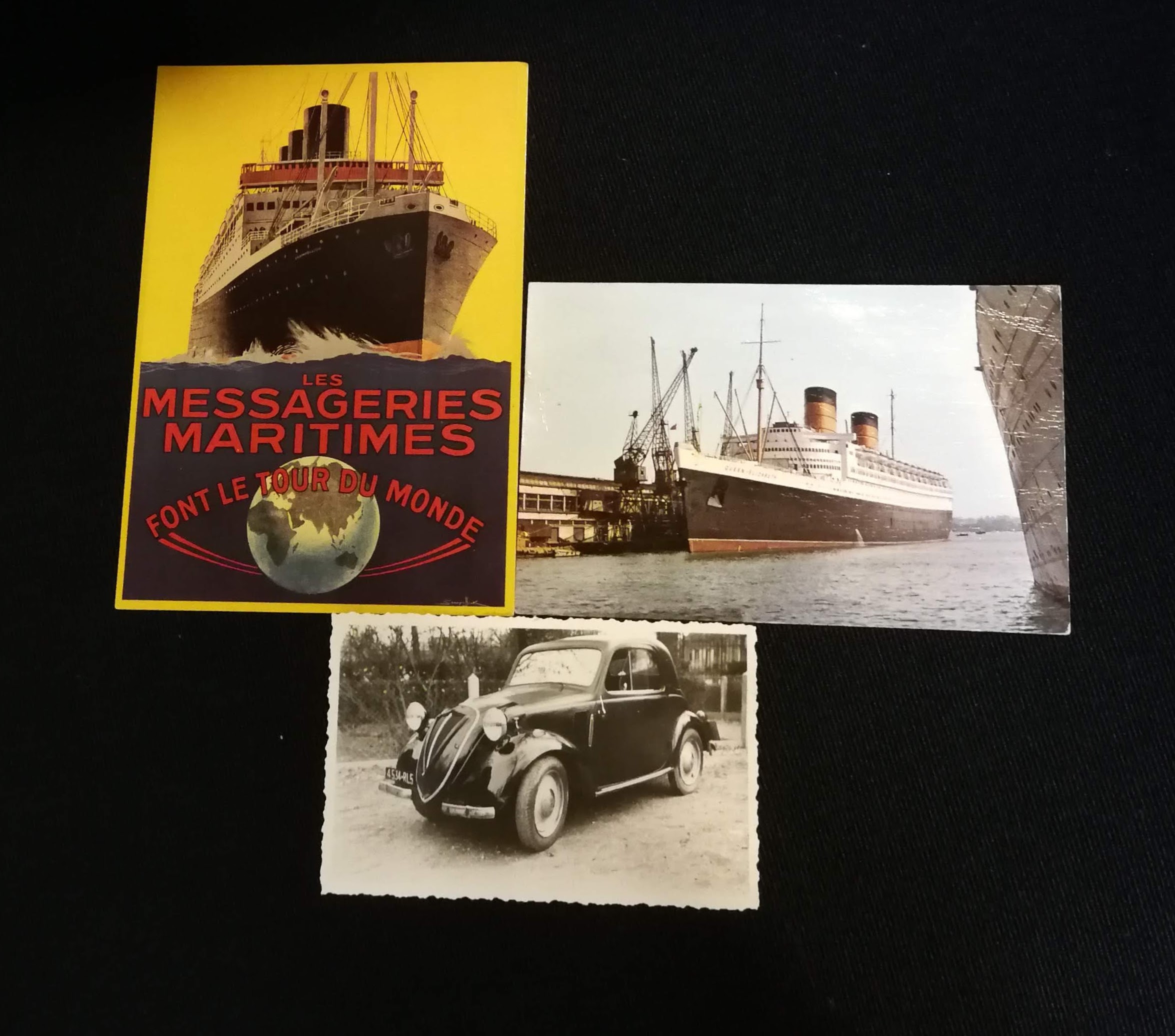 il y a une dixaines de cartes postales de paquebots, peu de photos de vieilles voitures, un grand nombre de cartes postales de Paris , de province, de l’étranger et d’autres de sujets divers;